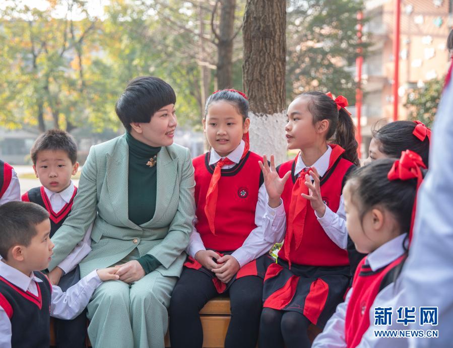2月21日,在重慶市九龍坡區(qū)謝家灣小學,劉希婭(左三)在校園內與學生們聊天。新華社記者 黃偉 攝