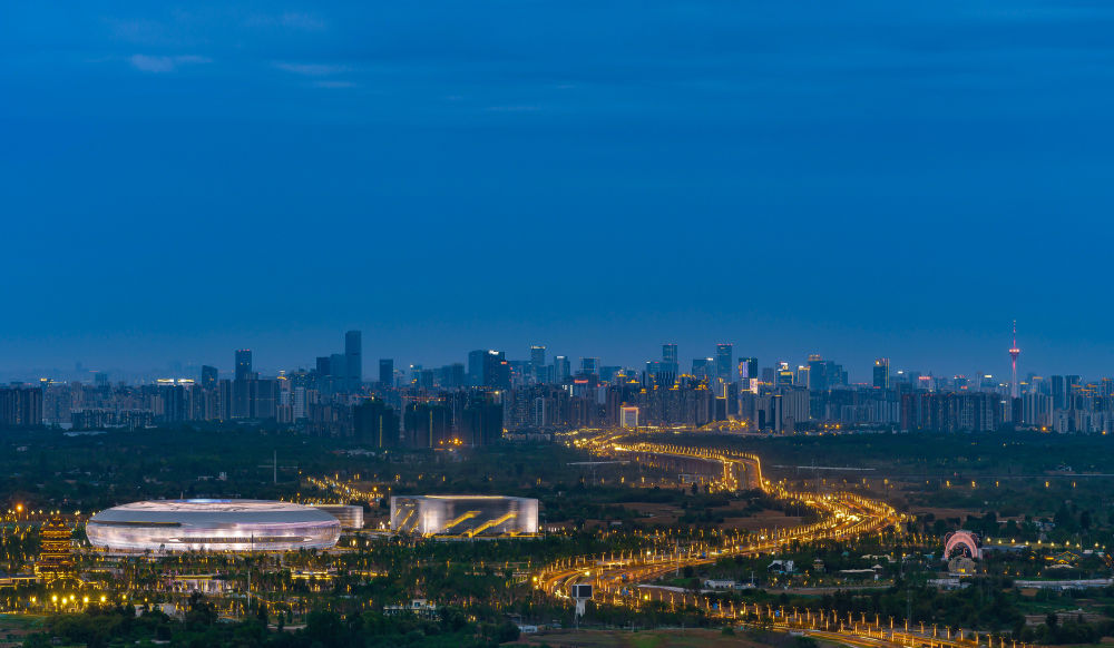 從龍泉山俯瞰夜幕下的東安湖體育公園(7月23日攝),成都大運(yùn)會(huì)開(kāi)幕式將于28日晚在此舉行。新華社發(fā)(廖鐵軍攝)