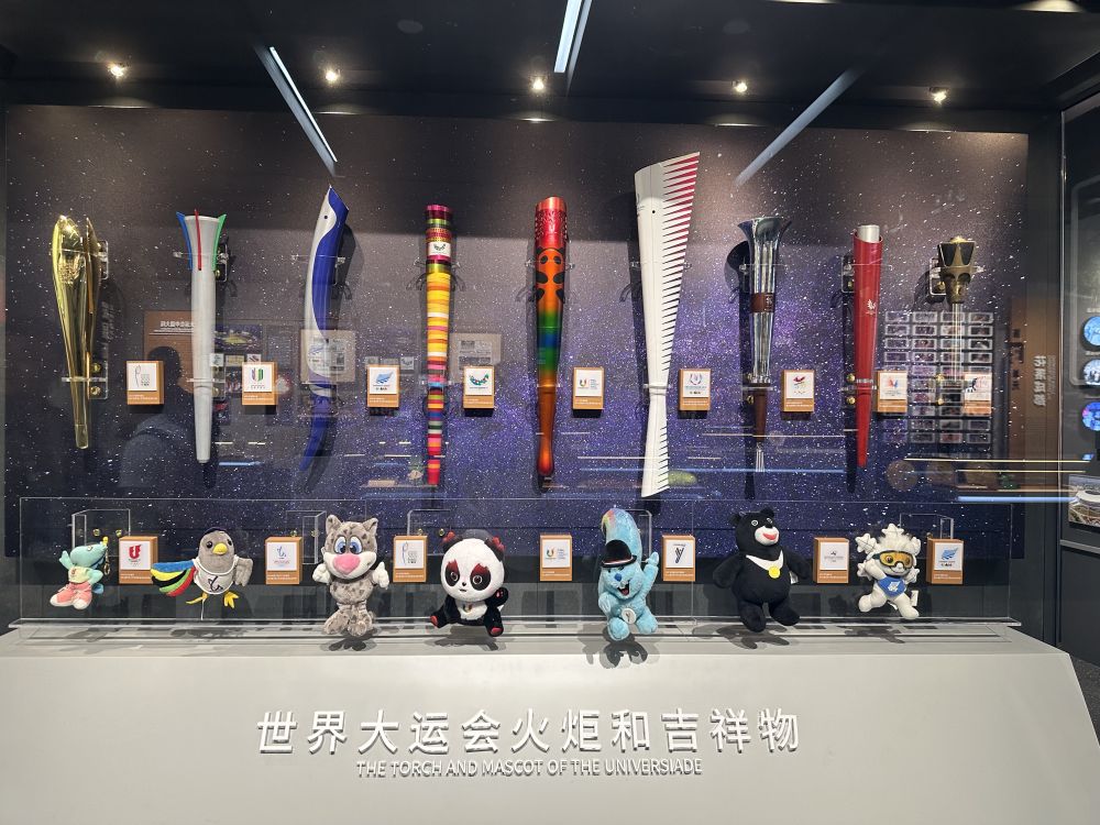 成都大運(yùn)會(huì)博物館內(nèi)展示的世界大運(yùn)會(huì)火炬和吉祥物
